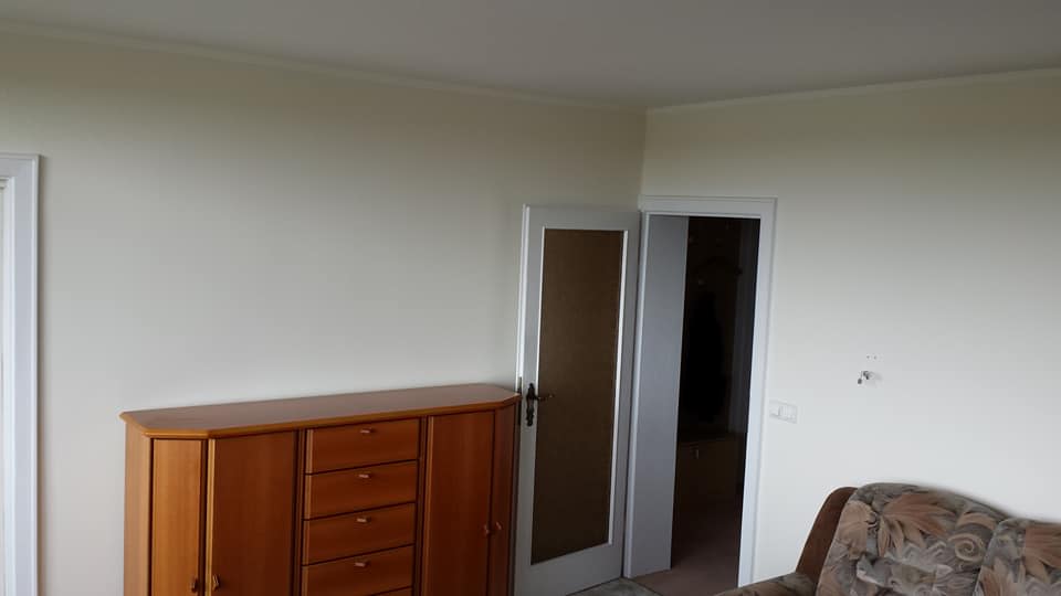 Glatte Oberflächen schmeicheln dem Auge und wirken ansprechend auf den menschlichen Tastsinn. Somit liegen schon zwei Gründe auf der Hand, warum glatte Wände nicht nur bei Neubauten sondern auch bei Renovierungen aktuell so gefragt sind. Auch dieser Kunde wünschte sich Veränderung. Es wurden die Tapete entfernt, die Decken- und Wandflächen grundiert, anschließend 2x vollflächig gespachtelt, geschliffen und wieder grundiert. Die Decke wurde weiß gestrichen und die Wandflächen leicht farbig abgesetzt.